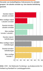 Oversigten nedenfor sammenligner bl.a. beskæftigelses-frekvensen for etnisk danske mænd i udsatte boligområder med etnisk danske mænd i befolkningen generelt.